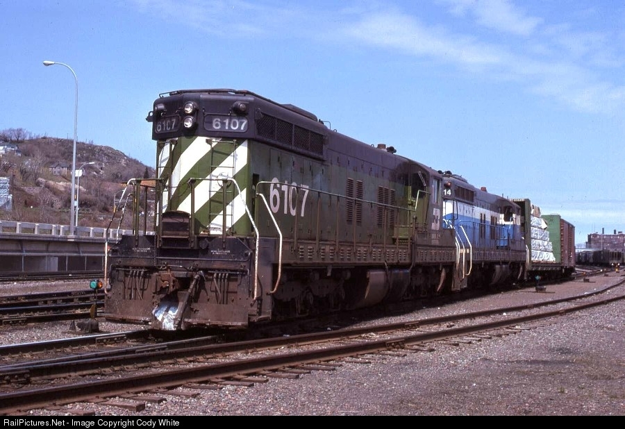 | Burlington Northern SD9 6107 and SD9 6114 are seen switching Bridge Yard in downtown Duluth May 1975. SD7/9s were pretty uncommon for switching duties in Duluth on the BN. These six axle EMD roadswitchers were more at home in Superior while EMD NW2, SW1200 and SW1000s were common switching power in Duluth during the 70s BN era. By 1973 the NP Alco switchers were retired and replaced by NW2 and SW1000s, so seeing BN SD9s switching in Duluth was definitely worth taking a photograph. J. David Ingles Photo from my collection. |