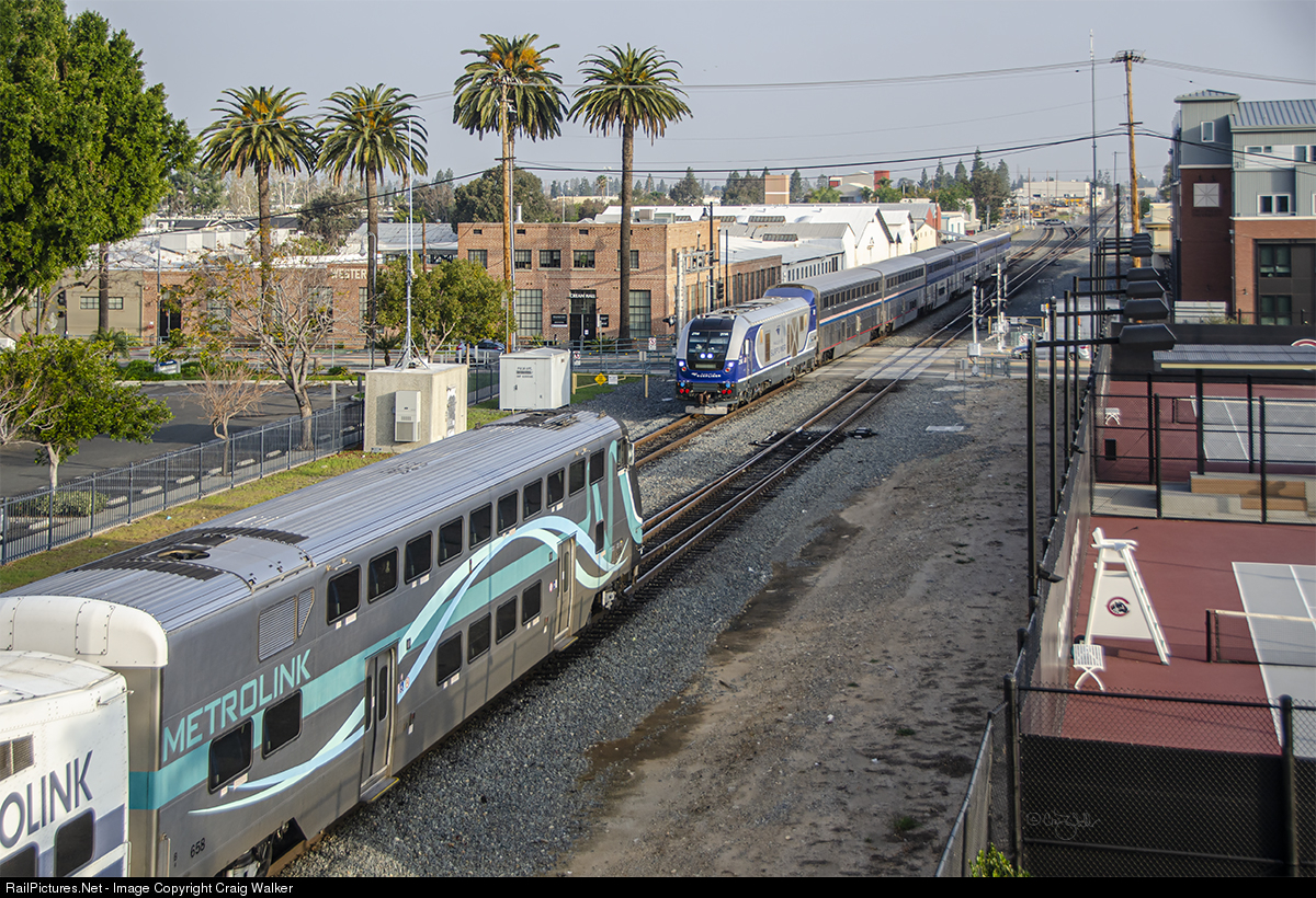 As Amtrak Pacific Surfliner 564 passes through CP Maple in the city of Orange, California, Metrolink commuter train 683 departs the commuter station there. CDTX SC-44 2114 is leading the southbound Amtrak train, while SCAX cab car 658 is leading the northbound Metrolink train. (Orange, California – February 19, 2020)