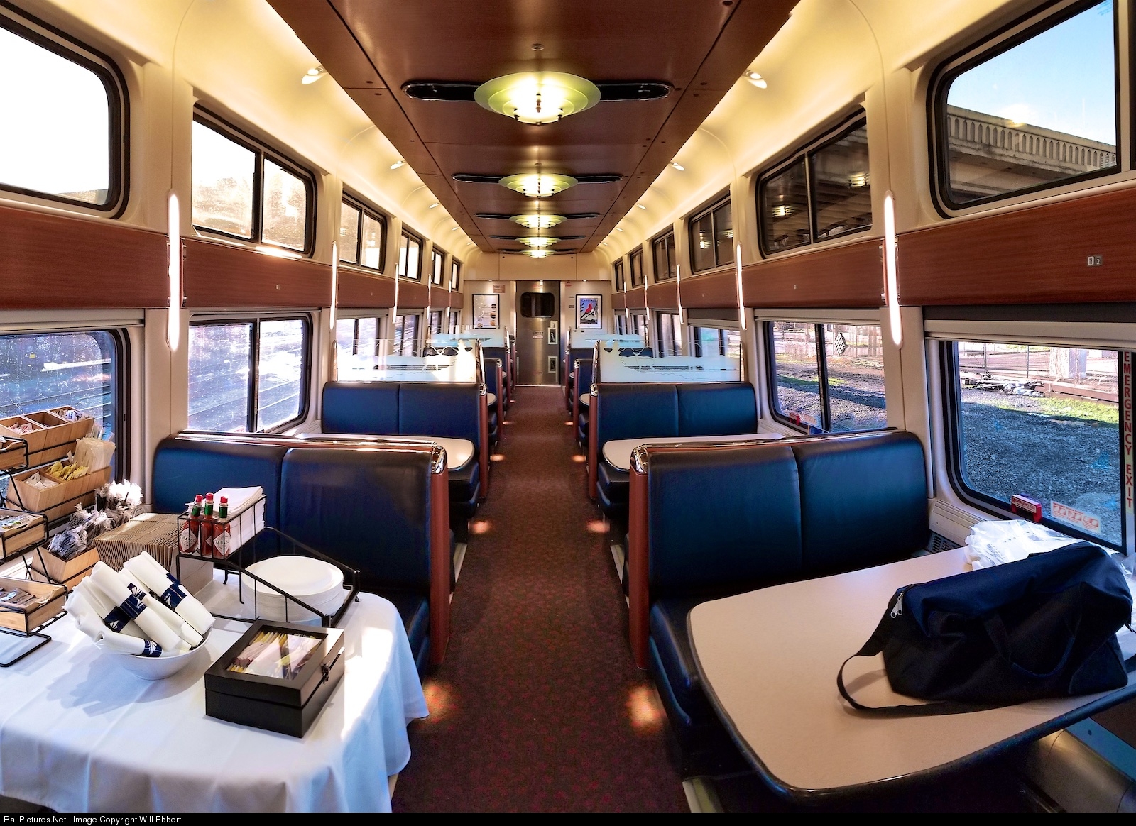 | Dinner in the diner, but where are the passengers? A few months ago, this car would have been full of passengers eating fresh cooked meals. Thanks to Amtrak's "flexible dining" policy, coach passengers are no longer allowed to eat in the beautiful Viewliner II dining cars and sleeping car passengers are given microwaved airplane style meals. Hopefully Amtrak will return the great foodservice to the rails. |