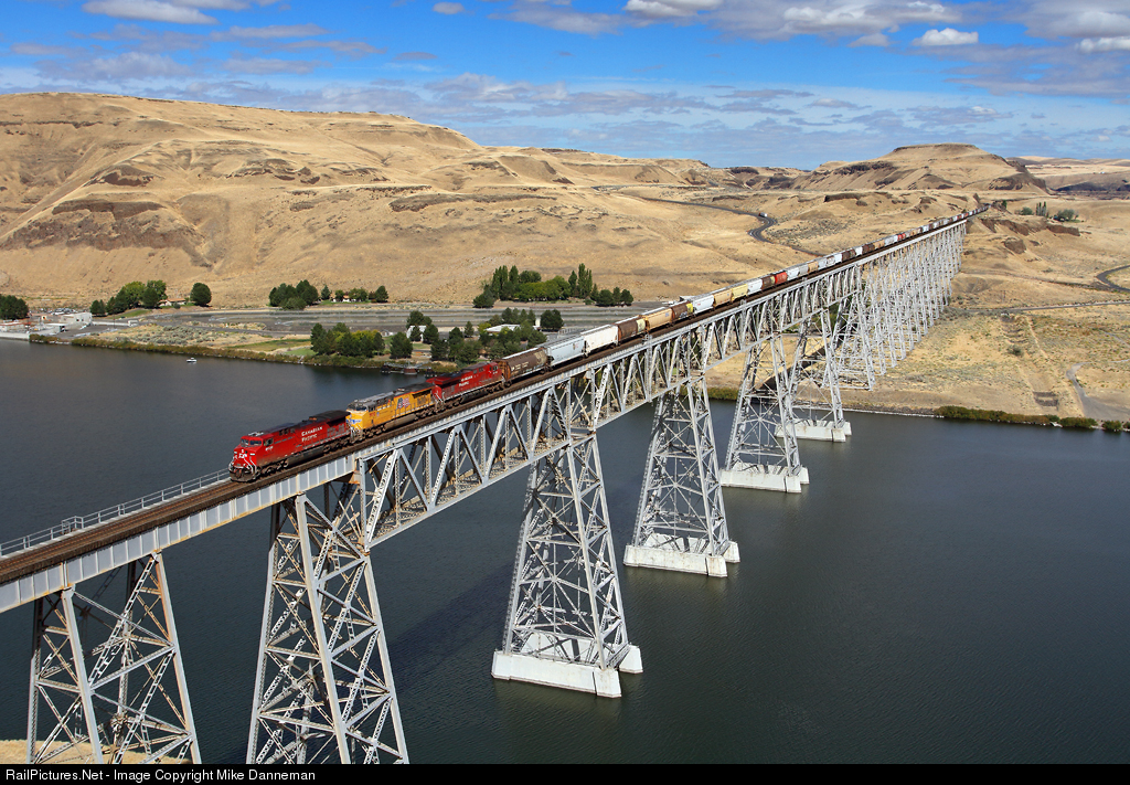 On September 21, 2015, Canadian Pacific AC4400CW No. 9620 leads a westbound Union Pacific grain train across the huge bridge spanning the Snake River at Joso, Washington.