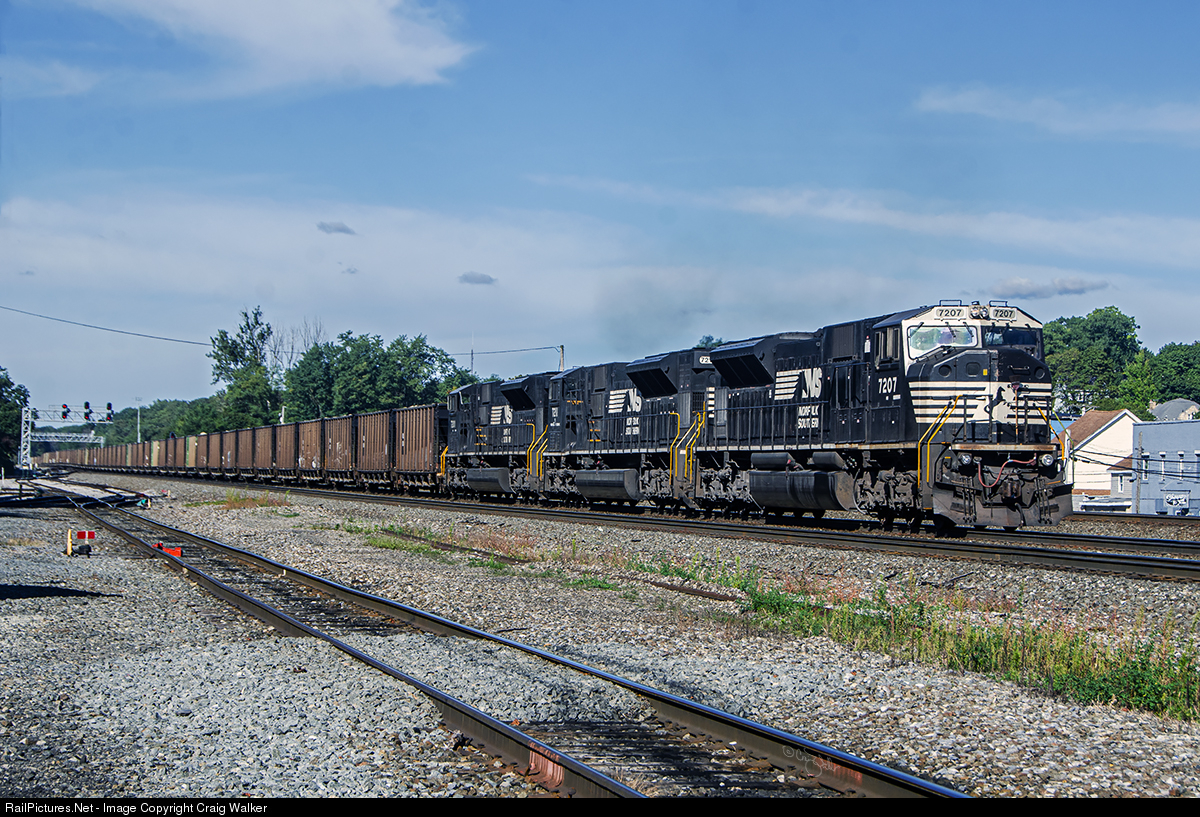 A Norfolk Southern coal empties passes through Cresson, Pennsylvania, on September 18, 2019. This train had five former Conrail SD80MACs for power: NS 7202 and 7216 up front, and 7201, 7211 and 7207 on the rear. By early 2020 all the SD80MACs on NS’s roster had been sold, with six of the units (7206, 7215, 7218, 7225, 7226, and 7227) sold to Canadian Pacific Railway, reportedly as parts sources. The other 23 units were sold to Progress Rail, the successor to builder Electro-Motive Diesel.