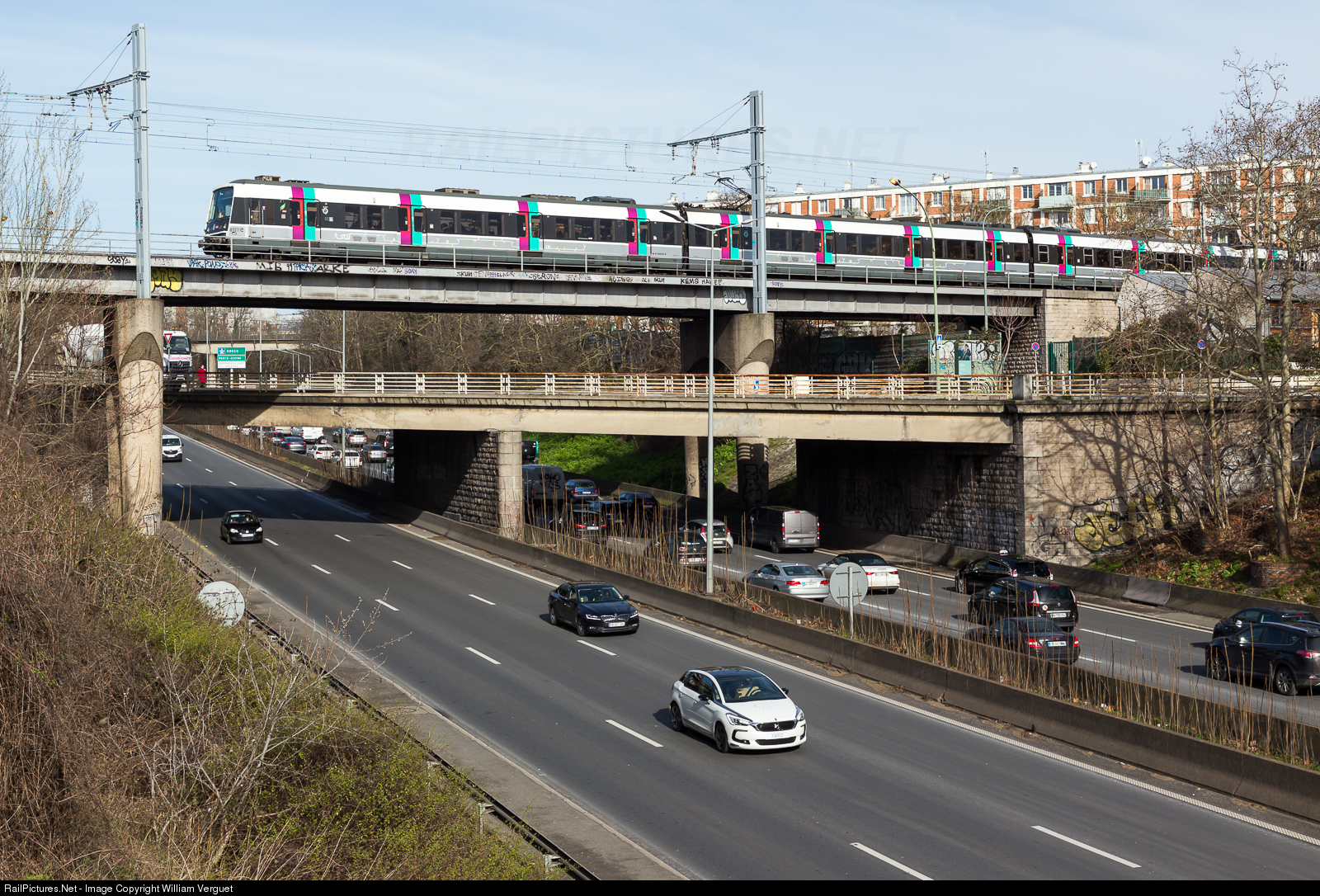 | This line RER B train, to Massy-Palaiseau, crosses the highway A6 Paris - Lyon near Laplace station |