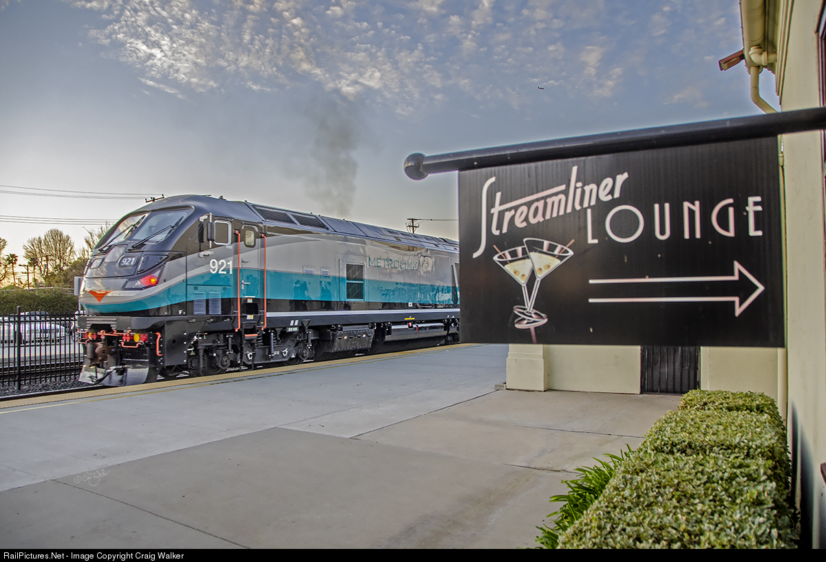 The old Santa Fe passenger station in Orange, California, replaced a wooden structure, and was dedicated on May 1, 1938. This depot remained in service until Santa Fe discontinued passenger trains on April 30, 1971. The next day Amtrak took over the Santa Fe’s San Diegans but the new carrier eliminated several of the stations between Los Angeles and San Diego, including this one. After sitting empty for several years, it reopened as a Cask 'n' Cleaver steakhouse. Commuter trains began stopping at this station again in December 1993 (first the Orange County Commuter's trains and, not long after that, successor Metrolink's Orange Line took over this service. By 2009, Cask 'n' Cleaver had closed its doors, but a new lease was taken out by Orange County-based Ruby's Diner (a 1940s themed restaurant chain) and after considerable remodeling, the station’s new tenant opened for business in 2011. This Ruby's had more room than usual, and so the company included the Streamliner Lounge in half of the old depot. The décor in the restaurant is decidedly "Santa Fe" in nature, with many touches copied from Los Angeles' Union Station, and a number of reproductions of old Santa Fe travel posters and old Lionel Trains advertising adorning the walls. On February 20, 2020, Metrolink train 689 (Irvine to Los Angeles) departs the station with F125 921 shoving on the rear.