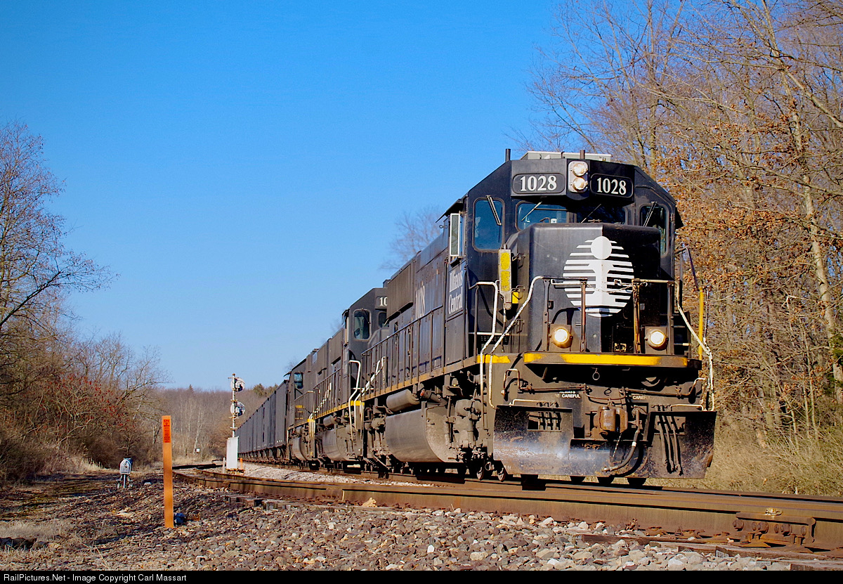 | With loaded new style ore hoppers in tow, the daily southbound glides through Saxonburg just past the site of the old US Steel sintering plant. In 20 miles the train pulled by matching Illinois Central “Death Star” locomotives will reach the North Bessemer Yard where it will exchange with the Union RR and grab a set of empties to take back north. |