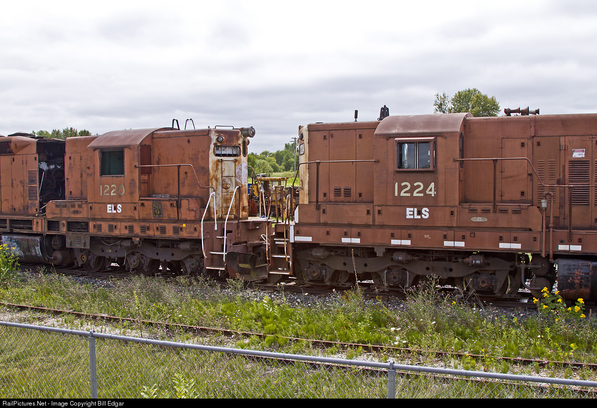 | Escanaba & Lake Superior SD9s nos. 1224 and 1220 rust away nose to nose at the shop facilities near the waterfront in Escanaba, MI. The units began life in December 1956 as RSMX 1220 and 1224, and were stored at the time along with nos. 1221 and 1222. |