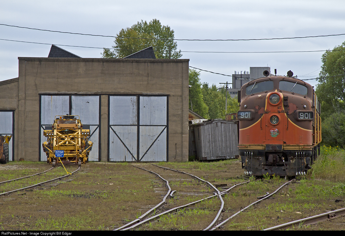 Former Wisconsin & Calumet F7A no. 901 sits at Escanaba & Lake Superior's shops at Escanaba, MI. The unit was built for Rio Grande in July 1949, no. 564D. It has been owned by American Crystal Sugar, Glen Monhart (Chicago Madison & Northern) and became WICT 901 in 1985. It went to Mineral Range in 1992 as MRAX 901, then the Green Bay National RR. Museum, and finally sold to E&LS as their no. 901. It appears to still be lettered and painted in the Ill. Central inspired scheme of WICT.
