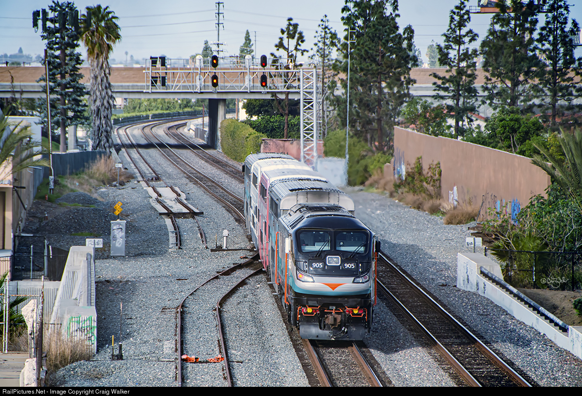 Metrolink F125 905 shoves on the rear of weekend service train 751 (Perris to Los Angeles) as the train receives an “approach medium” signal at milepost 43 on the BNSF San Bernardino Sub. This signal tells the engineer to proceed past the next signal not exceeding 40 mph, prepared to “advance on diverging route at next signal at prescribed speed through turnout.” In other words, this train will be switching from Track 2 to Track 3 as it approaches the station stop in Fullerton, 2½ miles ahead. A two-hour late Amtrak 3, the westbound Southwest Chief, is ten minutes behind this train and will also receive an “approach medium” signal, but it will switch to Track 1.