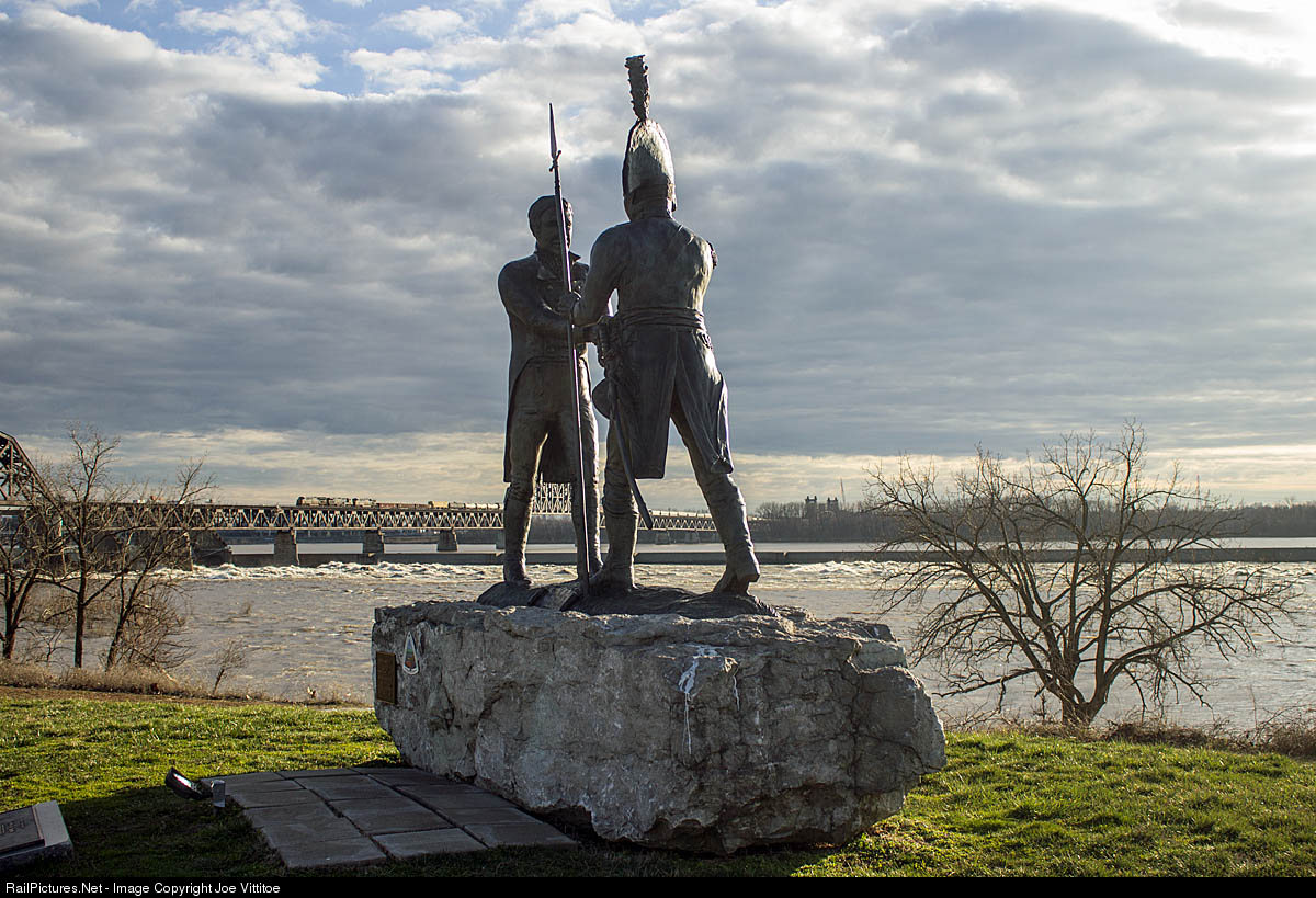 The statues of Meriwether Lewis and William Clark overlook the Ohio River where they met in 1804 to begin their trip to the northwest while northbound CSX Q574 crosses the river