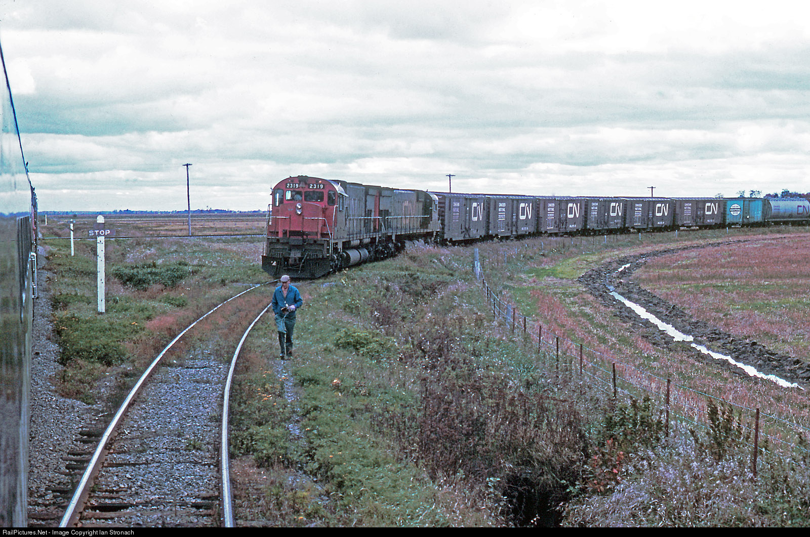 I am aboard CN's crack passenger train No. 61, The Rapido, from Montreal to Toronto. Due to a derailment on the mainline in Dorval (suburban Montreal) all trains coming from and heading to the west had to take a time consuming detour at Coteau through Ayrness and Delson and across the Victoria Bridge to Montreal. We are at Ayrness where the Valleyfield Sub. and the Massena Sub. cross and connect via a wye. We currently are Passenger Extra 6774 West on the Massena Sub. The freight is stopped on the connection from the Valleyfield to the Massena Sub. When our tail end clears the wye switch the head end brakeman will line the switch for Extra 2319 East to move off the Valleyfield Sub. and head to Delson on the Massena Sub. Once the freight clears we will make a reverse move and then proceed on the wye connection westward on the Valleyfield Sub. to Coteau and then return to the mainline. This detour added more than two hours and a half hours as this was single track train order territory and we had to meet an eastbound passenger train at Delson and then this freight at Ayrness.