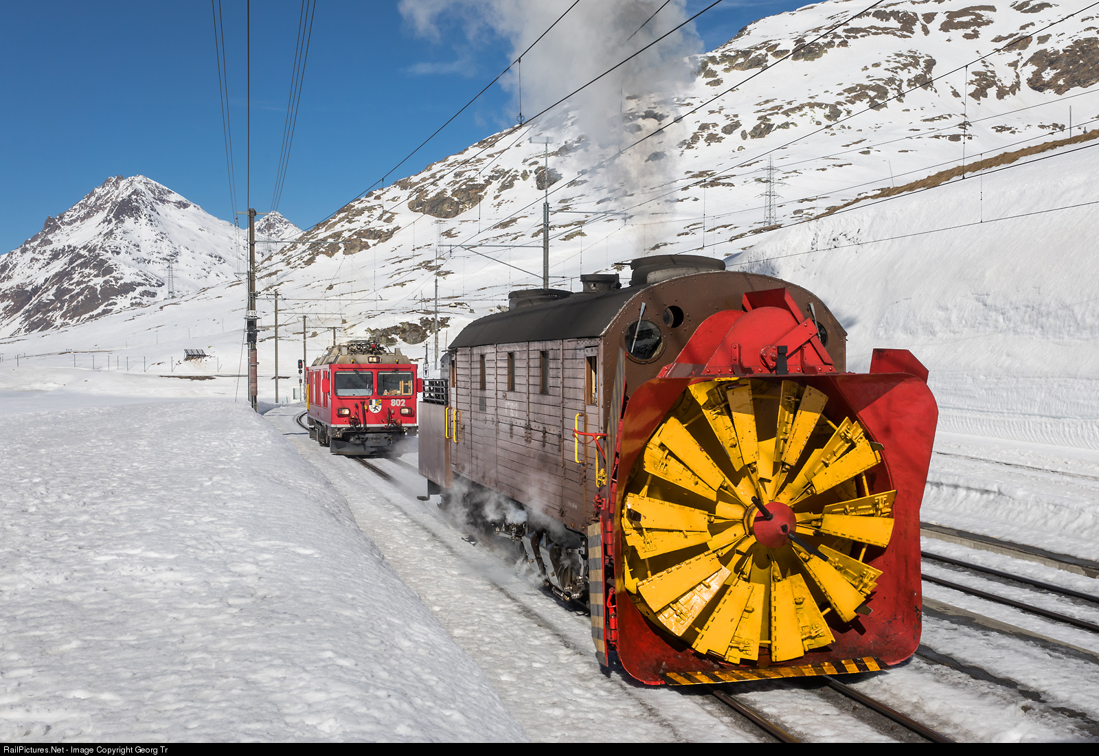 | The self-propelled steam rotary snow blower is entering Ospizio Bernina on a staff training run from Pontresina, followed by the dual power locomotive Gem 4/4 # 802 "Marmotte". |
