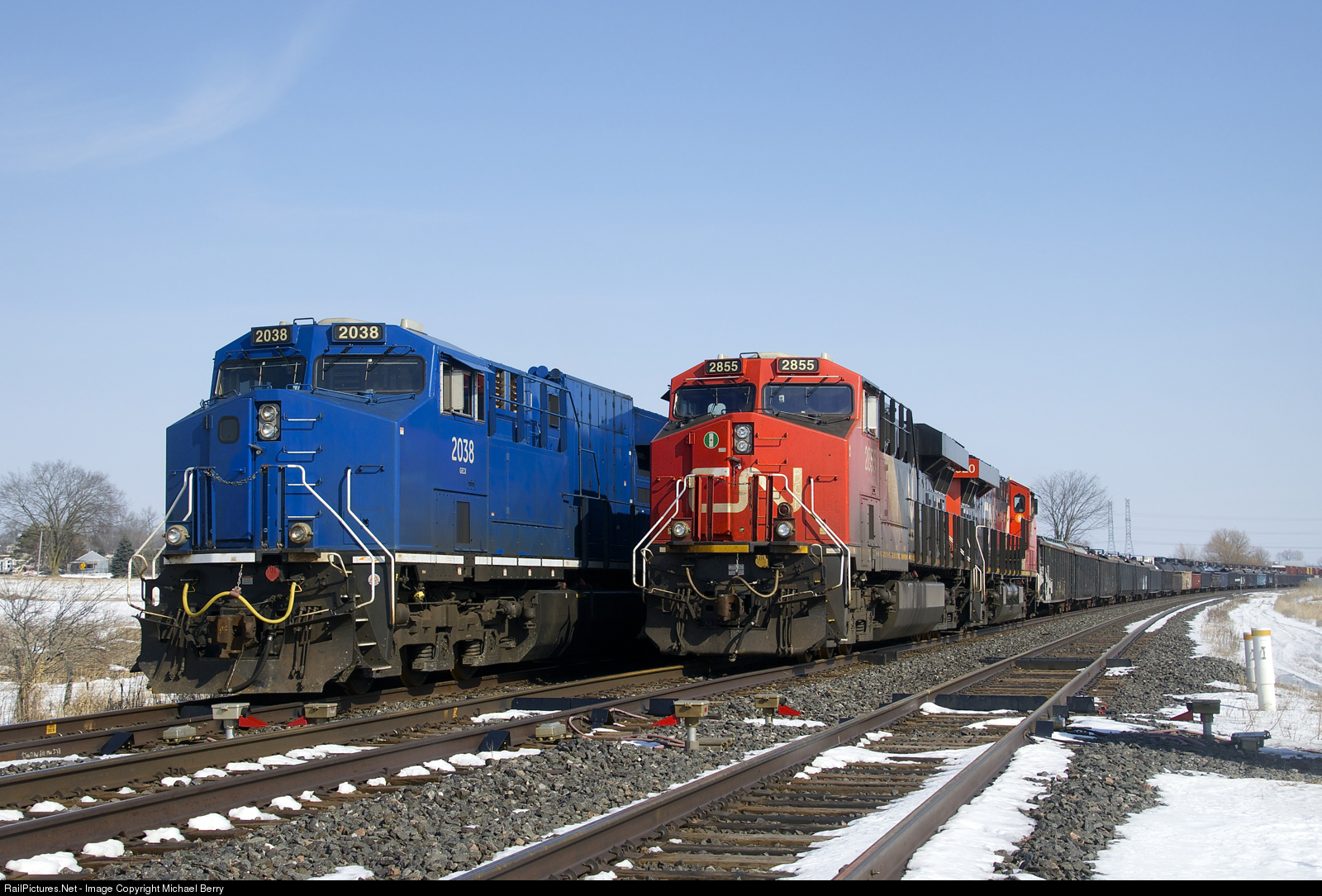 | Two trains (M37721-06 & M32121-06) are parked near a crossing at MP 202.77 of CN's Kingston Sub, unable to continue west due to a protest on CN's main line along Tyendinaga Mohawk territory at the time. Apparently the line has reopened this evening. Of note is that GECX 2038 will soon be repainted into CN colours and receive a CN number. |