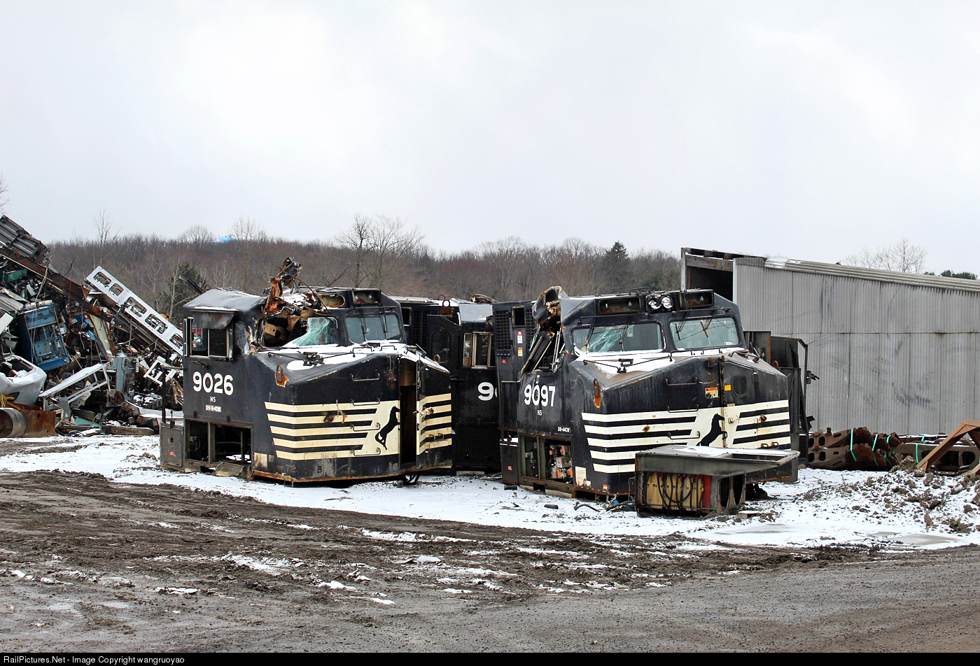 The cab sections of three NS Dash 9 locomotives sit at Cresson Steel's yard, waiting to be scrapped.