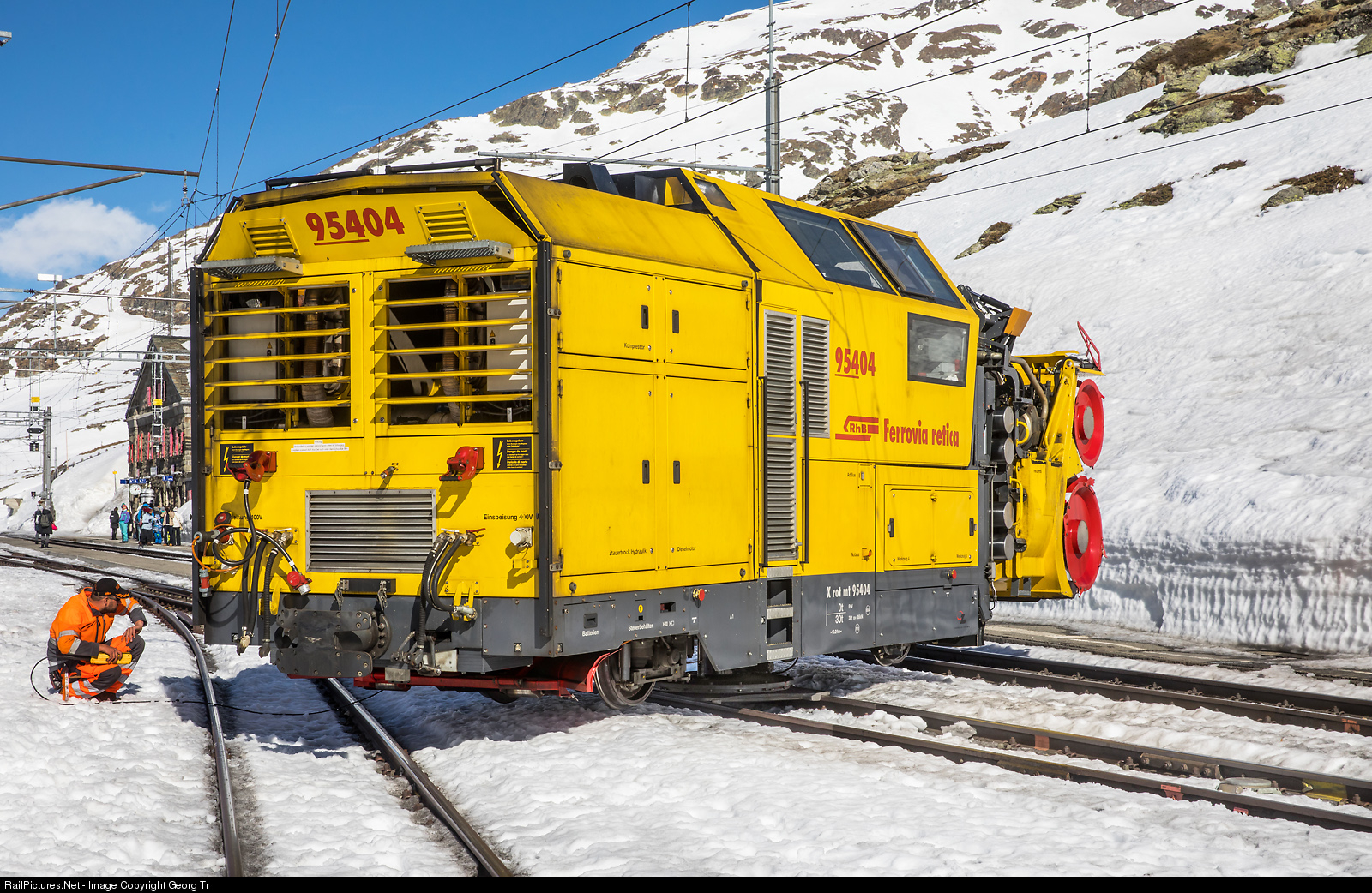 The "Zaugg" diesel snow blower Xrot mt # 95404 of the Rhaetian Railway for the Bernina line is turned by 180 degrees, by supporting itself on a ram on the track, lifting, rotating and lowering again. The procedure to turn the 31 ton blower takes about 5 minutes and is controlled via a cable remote control. Seen from the backside of the snow blower, we can see the open ventilation flaps and the red, now lifted, track plough, which is pulled on rollers on the rails. The rotating procedure is very rarely used, because the sister snow blower # 95403 based in Poschiavo stands with the spinning direction reversed than the machine from Pontresina.