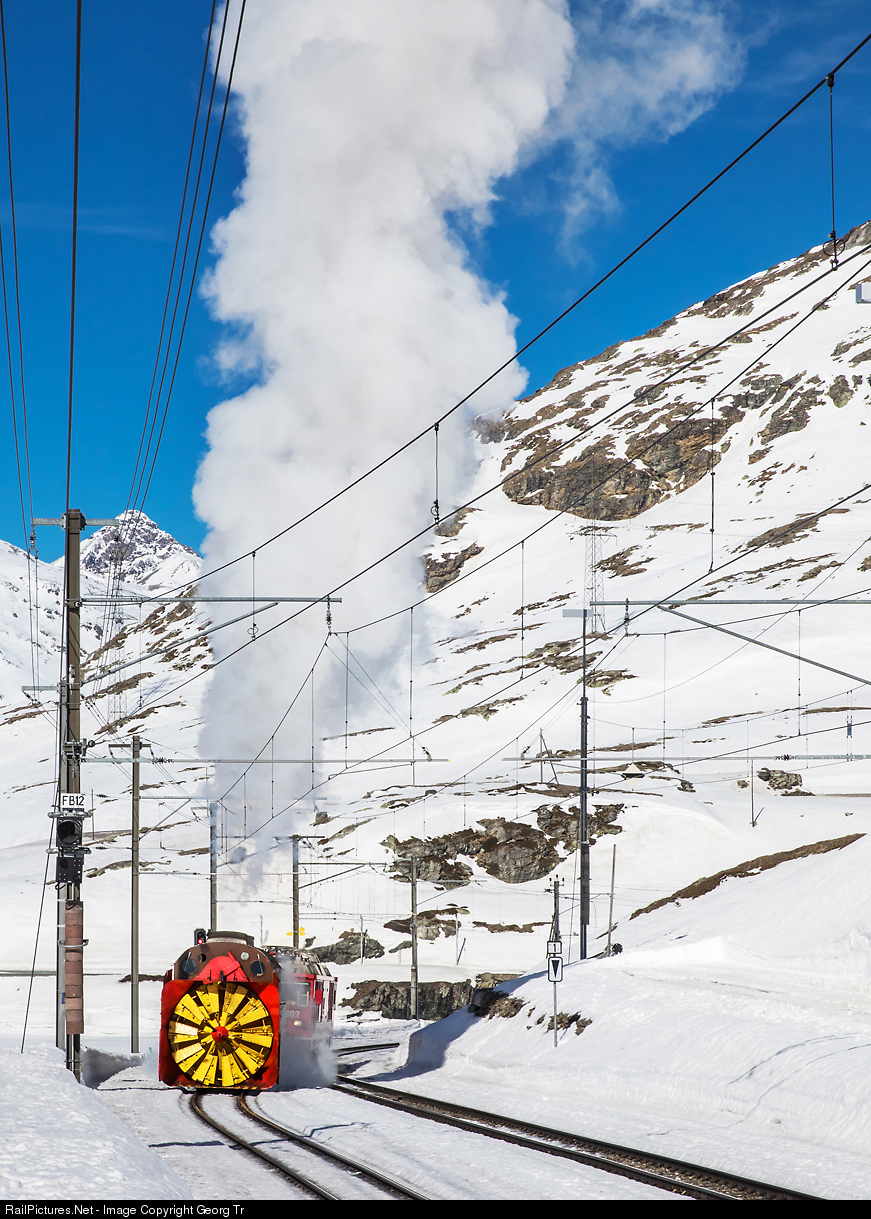 | The self-propelled steam rotary snow blower Xrot d # 9213 is entering Ospizio Bernina, on a staff training run from Pontresina. Following in only some meters distance is the Gem 4/4 # 802. From the watershed the two vehicles circulated uncoupled.