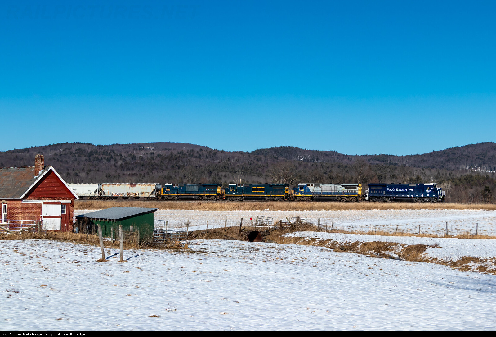 A frozen aggacultural setting makes for a great scene as a detoured Pan Am 16R rolls into East Northfield. A sting of luck has happened with these detours keeping those rolling dumpster fire CSX patches units trailing.