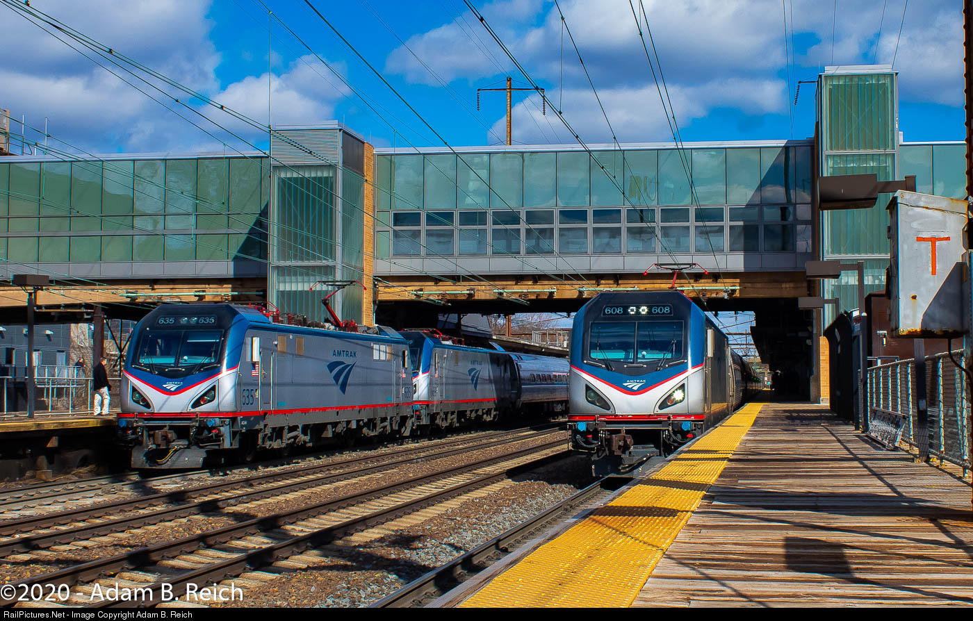 Chamber Day in Trenton: ACS-64 #608 arrives with Northeast Regional Train #125 on Track 1 at the Trenton Transit Center, as the NJ Chamber of Commerce Walk to Washington 2020 Charter, Train #867, boards on Track 4. Note the doubleheader leading the charter. Photo taken on February 27, 2020.