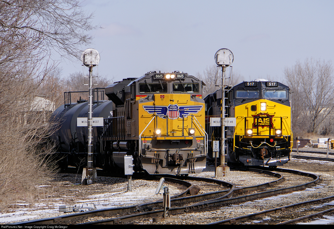 Iowa Interstate power waits as Union Pacific's Peoria local "01" job passes into the interlocking plant at Wesley. The "01" job will then back into the TZPR yard while the Iowa power will back into a waiting train.