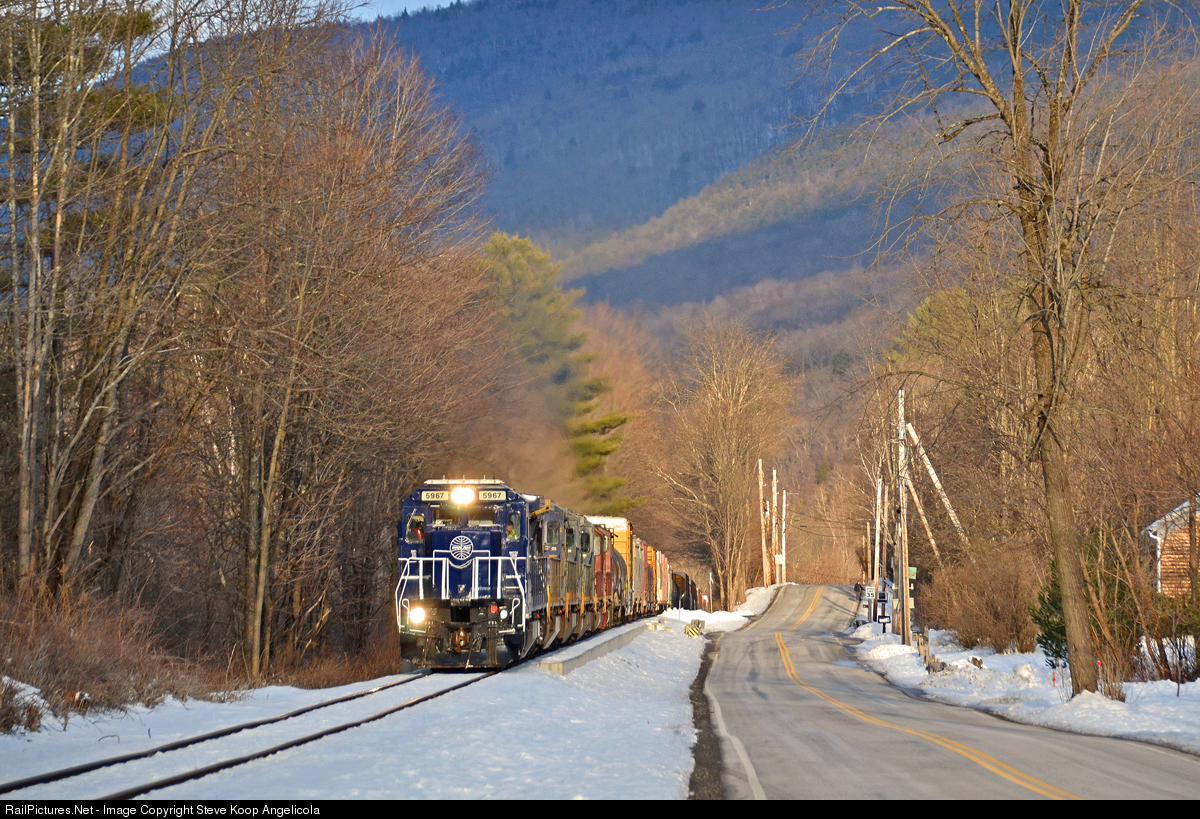 | Pan Am train 11R detours over the Vermont Railway climbing the grade along Sunderland Road en route to Hoosick Jct. Pan Am has been detouring this train over the Vermont Rail System to avoid the closed Hoosac tunnel in Mass. |