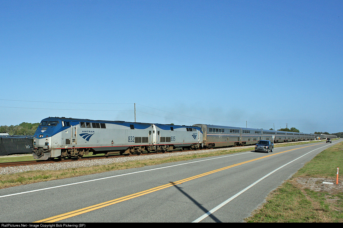 | Running a little bit late Amtrak's eastern Flagship, Autotrain hustles past the fern farms of Seville, Florida. Word is that Siemens chargers will be coming soon which may change this scene. |