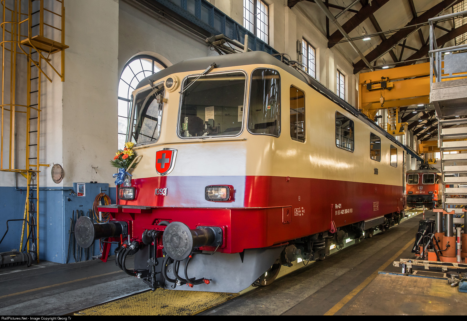 In autumn 2019, the International Rolling Stock Investment Gmbh (IRSI) bought the two Re 421 # 387 and # 393 from SBB Cargo for the sugar beet traffic mainly. Today, the # 393 left the large hall of the industrial plant Bellinzona of the SBB (IW Bellinzona) after a revision as # 11393 in a wonderful red/cream paint scheme, as a reminiscence of the golden years of the TRANS EUROP EXPRESS trains, with the original numbers in chromium on the front and the sides. This locomotive was built in 1985 by SLM/BBC/MFO and SAAS for the SBB in red paint scheme and was rebuilt in may 2004 for SBB Cargo as Re 421 # 393 with certification for Switzerland, Germany and Austria and in the blue/red Cargo paint scheme. In 1969, the 4 Re 4/4 II # 11158 to # 11161 were delivered in this TEE paint scheme for pulling the TEE "Helvetia" between Basel and Zürich and the "Roland" between Basel and Chiasso and vice versa. In 1972 another 5 Re 4/4 II # 11249 to # 11253 were delivered in this paint scheme for pulling the TEE "Lemano" between Domodossola and Geneva and the "Cisalpin" between Vallorbe and Domodossola and vice versa. After the discontinuation of the TEE trains in the early 1980', this 9 locomotives lost their special paint scheme and 6 are now running in red, # 11160 as Re 420 # 160 in the blue/red Cargo paint scheme, # 11161 in green and # 11253 as Re 420 # 253 in the Cargo paint scheme blue/red. The Re 421 # 393 (Re 4/4 II # 11393) of the IRSI will mainly run for the TR Trans Rail railway for charter, transfer and special trains. The Re 4/4 II # 11393 or Re 421 # 393 is standing in the large hall of the Hauptwerkstätte (industrial plant) Bellinzona, built in 1919 and called "cathedral". In the background is sister locomotive Re 421 # 387 of the IRSI, which will undergo a revision also.