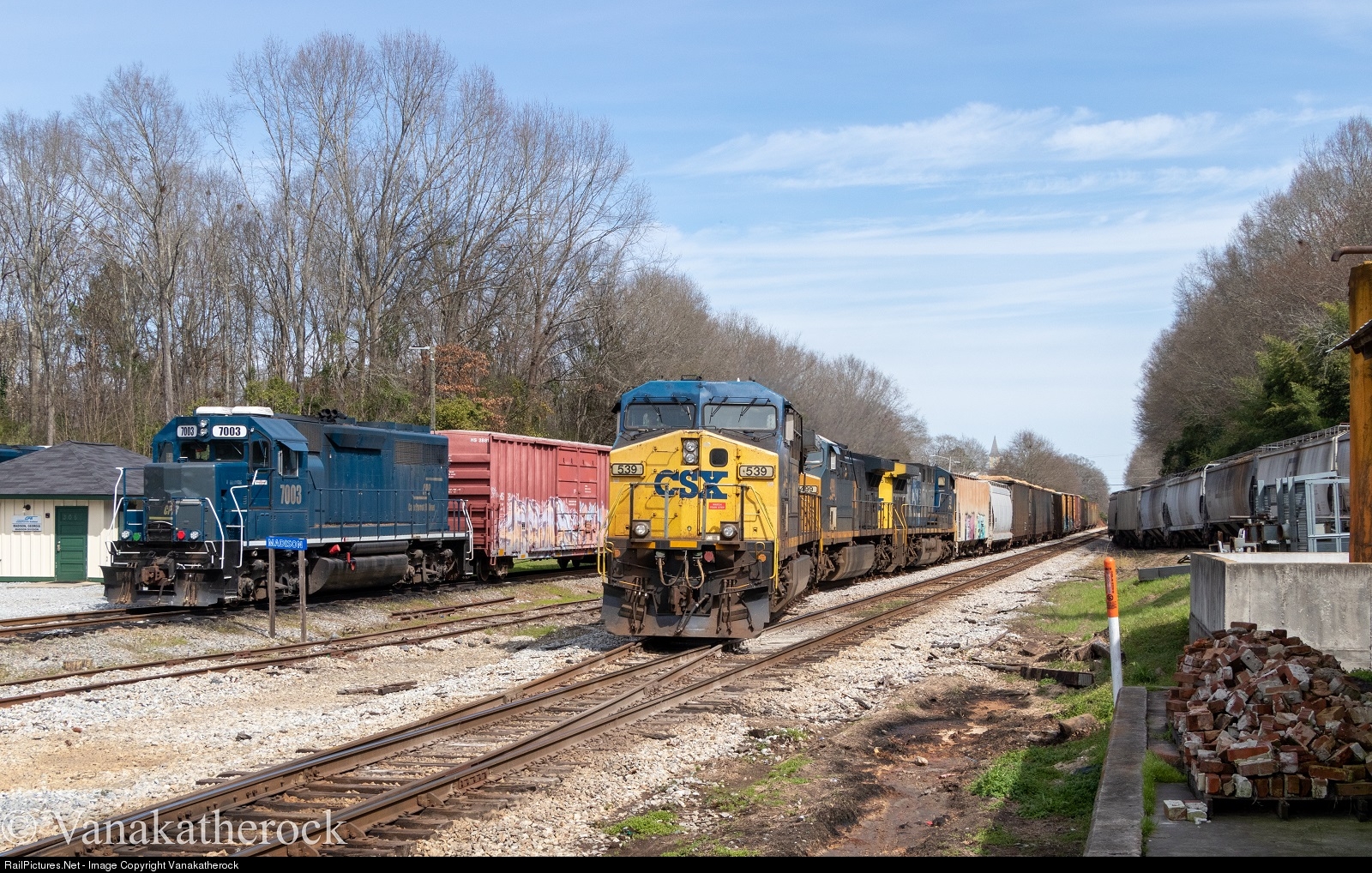 CaterParrott RailNet's Madison local rests this Sunday afternoon while CSX local freight A758-23 pulls out of the manual switched siding in Madison, GA to head back west after meeting a pair of eastbound road trains.