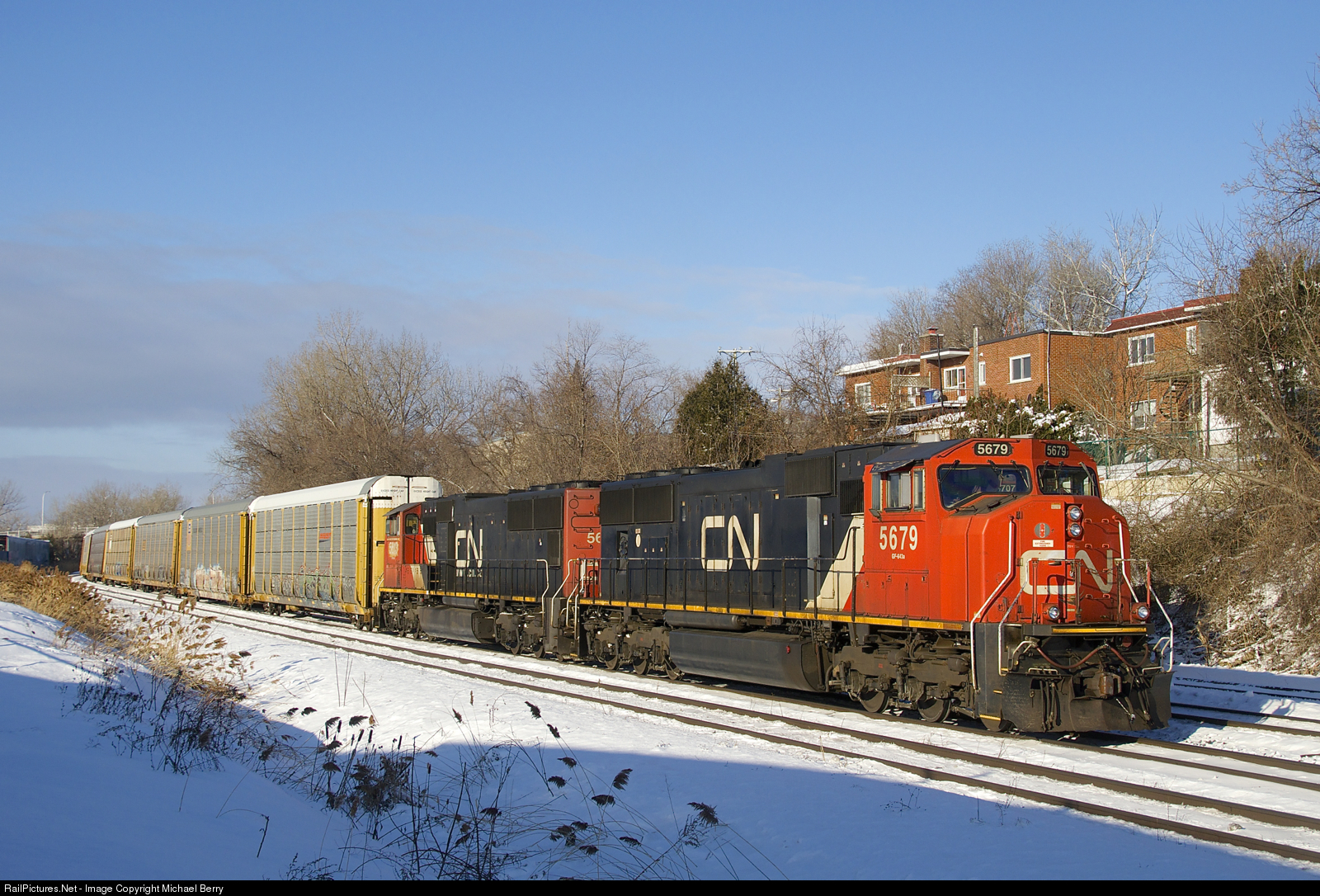 | Autorack train CN X276 has CN 5679 & CN 5613 for power as it sits parked on CN's Montreal Sub. CN 276 normally terminates in Ontario, but this train will eventually head to Joffre yard near Quebec City. |