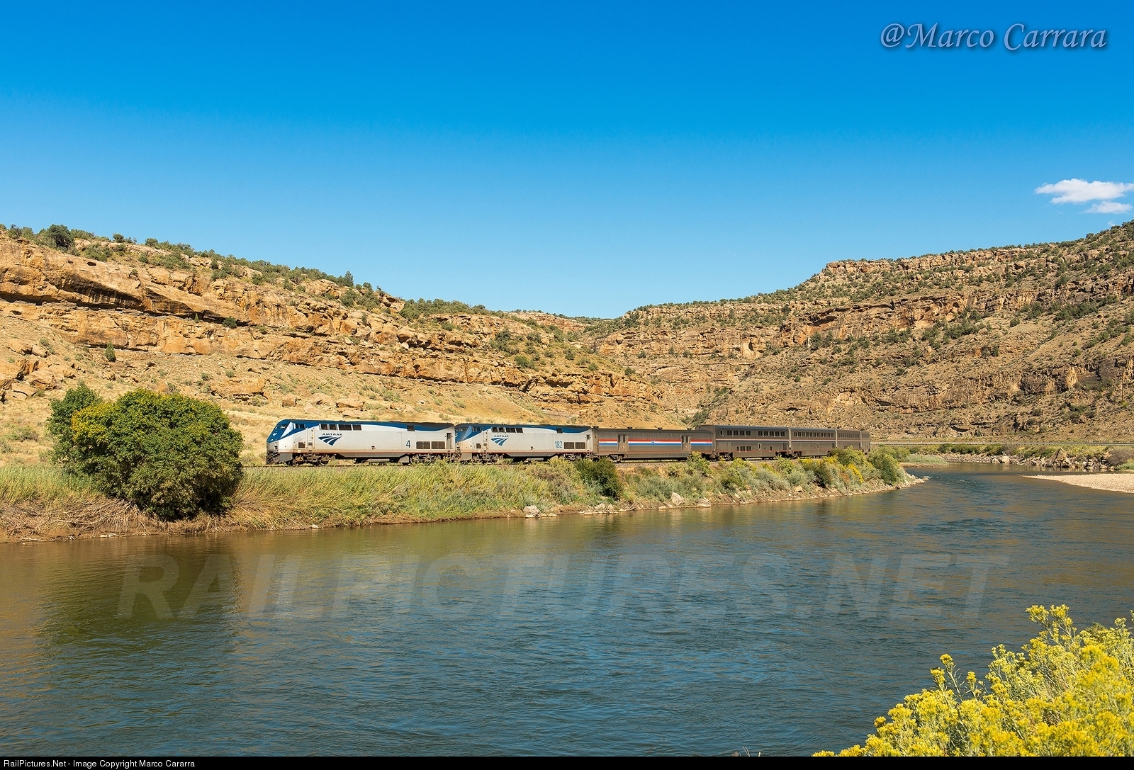 | On the banks of the Colorado River passes the Zephyr N ° 5, an Amtrak passenger train that connects Chicago (IL) with the bay of San Francisco (CA), after a two-day journey and almost 4000 Km traveled. |
