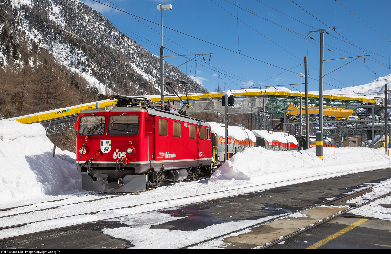 Ge 4/4 I # 605 "Silvretta, built in 1953, with the freight train 6146 from Samedan to Preda, shunting in Spinas. One laoded ciment car was left here and an empty car was coupled on the tracks of the construction site for the Albula tunnel II, which will be opened in late 2021.