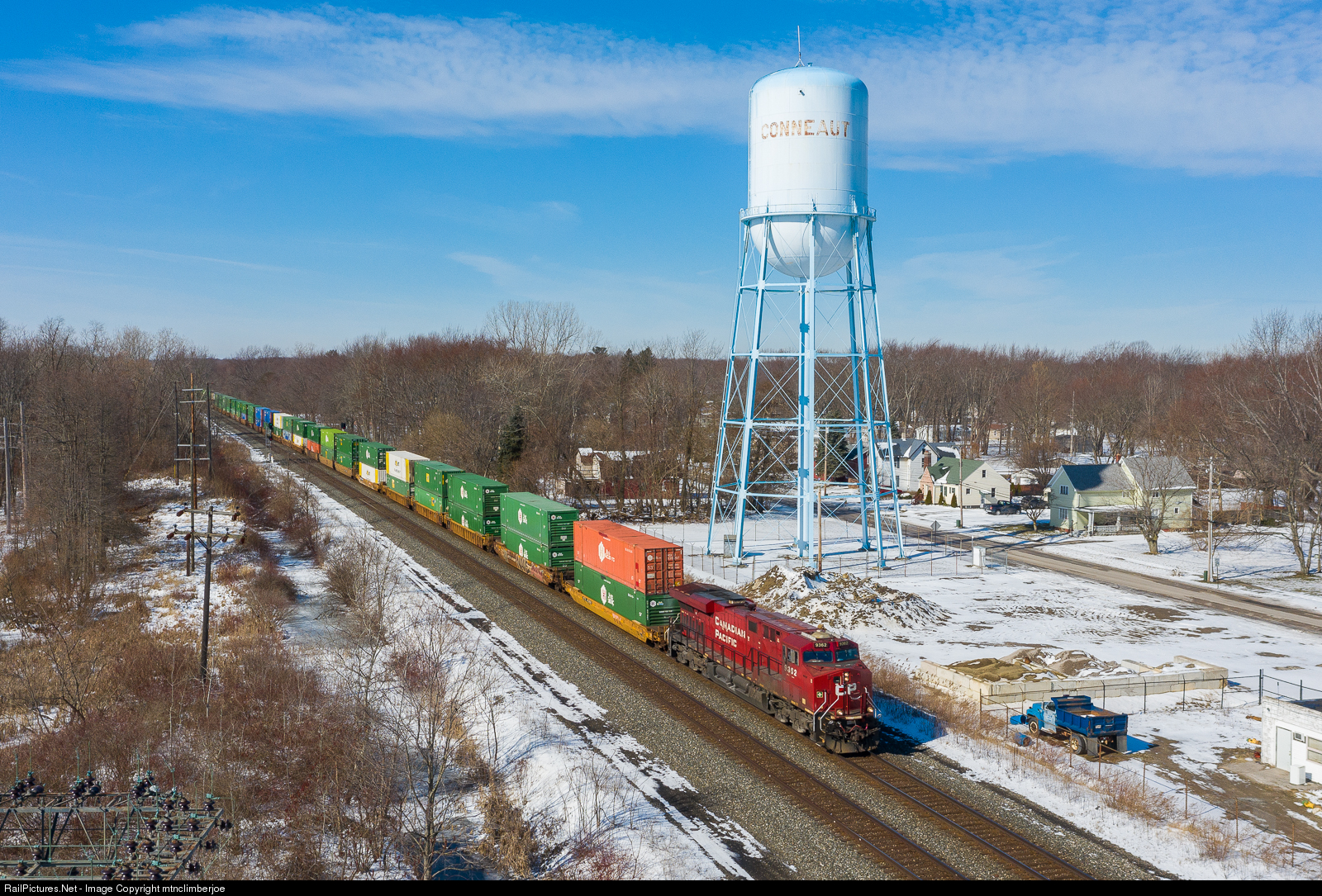 | Eastbound CP run through intermodal Q166 travels through Conneaut, Ohio over CSX rails and passes the town's water town. ES44AC 9362 is on the head end with two AC4400's as midtrain DPU's. |