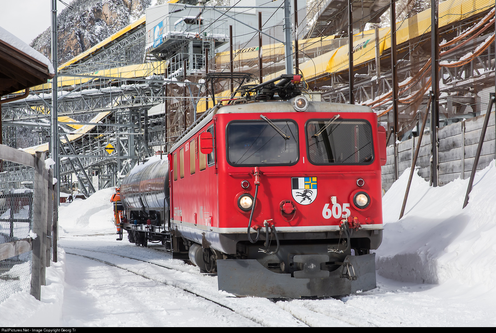 The "old warhorse" of the Rhaetian Railway, locomotive Ge 4/4 I # 605 "Silvretta" dating from 1953, in the construction site yard in Preda for the Albula tunnel II, shunting an empty ciment tank car Uac. In the background several conveyer belts of the construction plant.