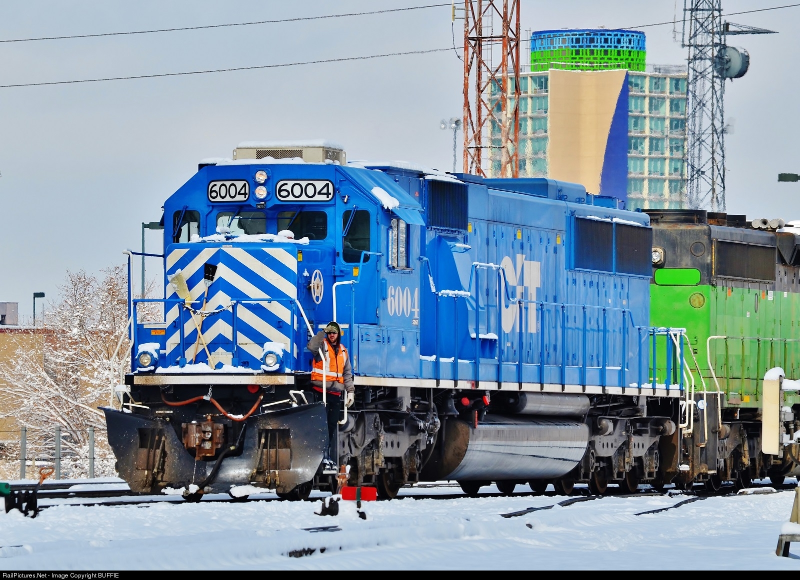| A colorful CIT 6004 (SD60) moves from the BNSF Denver Yard through the snow towards the downtown engine servicing facility to take on fuel and sand. The shade of CIT blue and the Cascade Green of the trailing BN unit oddly matches the coloring on the mechanical penthouse of the building in the background. |