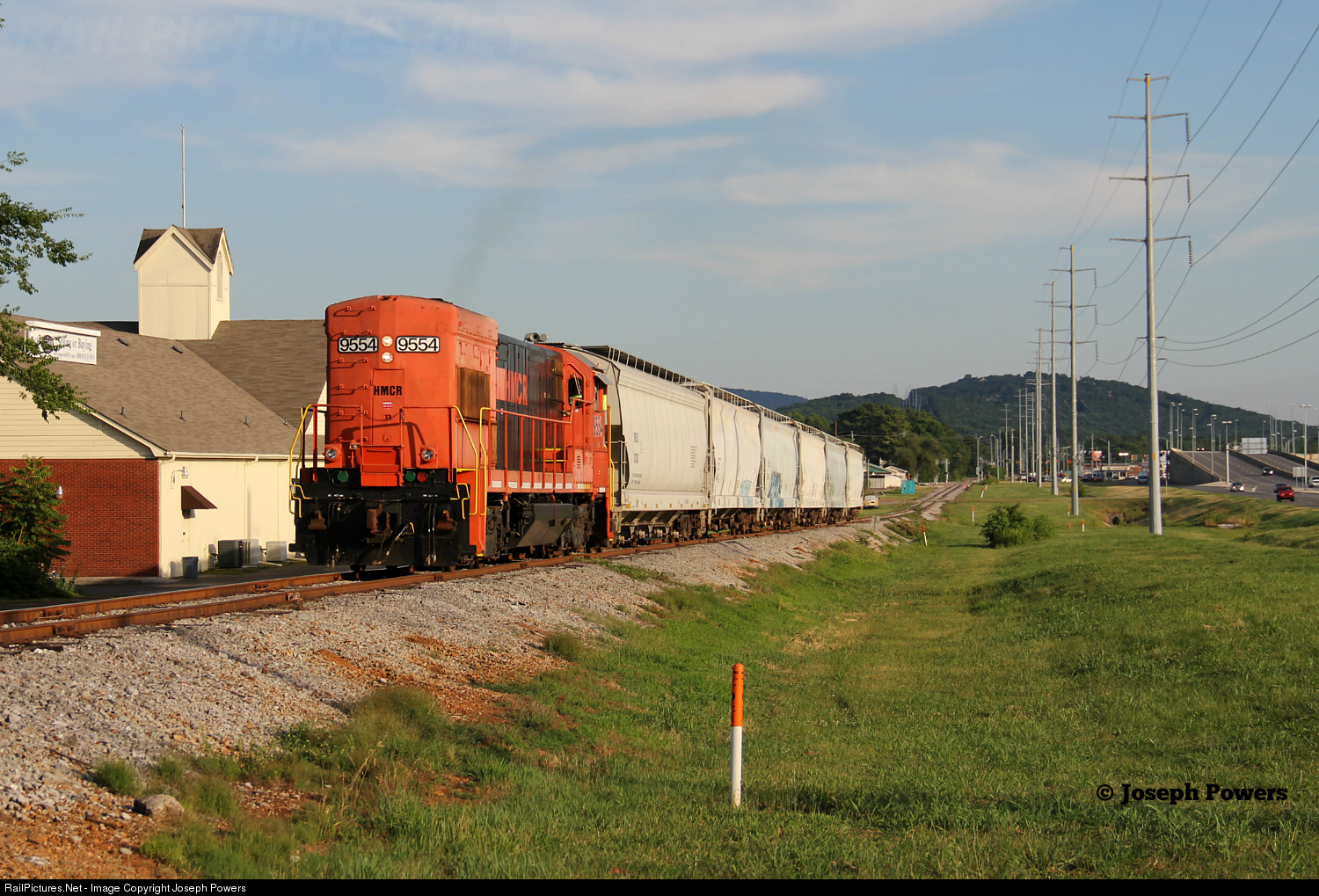 With six covered hoppers in tow, northbound Huntsville and Madison County Railroad Authority U23B 9554 approaches the Lily Flagg Road crossing in Huntsville, Alabama.