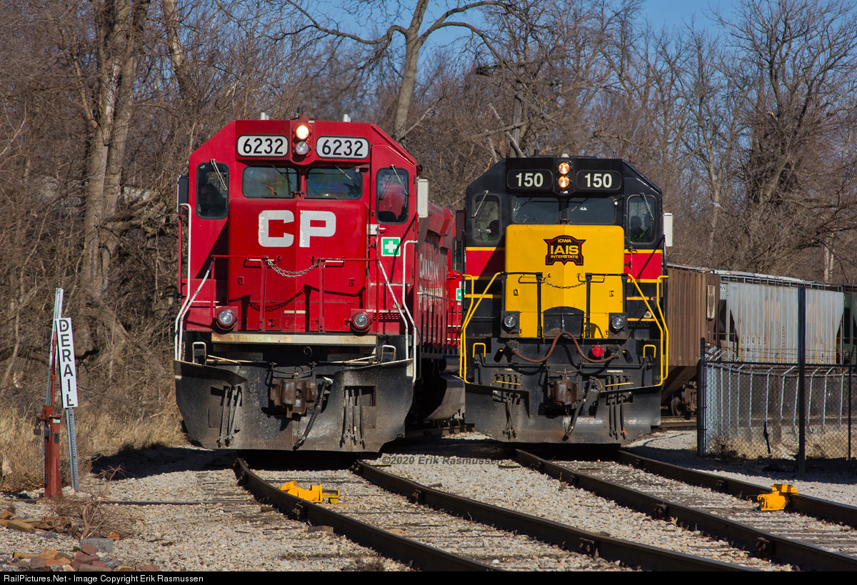| Iowa Interstate's Silvis Switcher is in the clear while Canadian Pacific's B71 crew has tied onto the empty potash train it brought over. The current era of SD38-2's on the IAIS has ended with 150 and 151 being laid up today. |