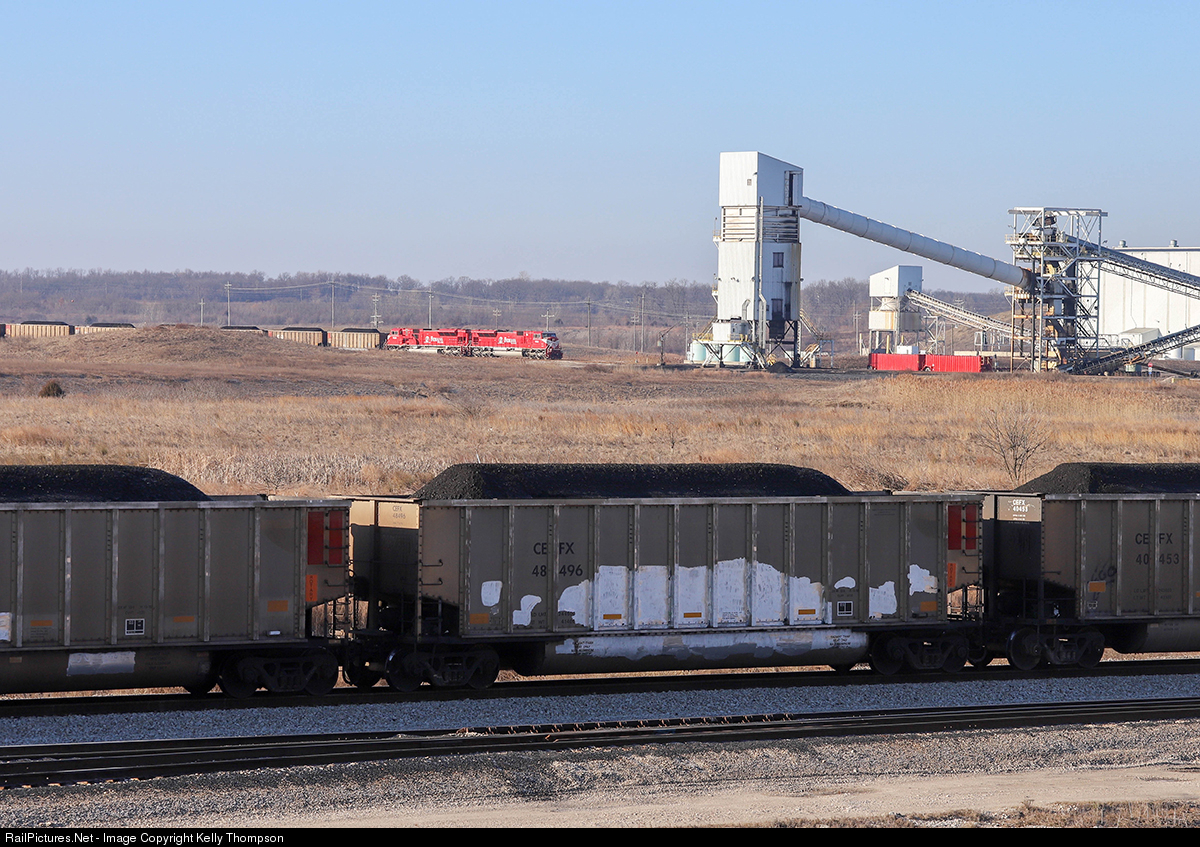 | A loaded INRD coal train sits waiting for a crew to take the black diamonds to the Merom Generating Station. You can see INRD 9001 behind the end of its train wrapped around the loop at Bear Run. |