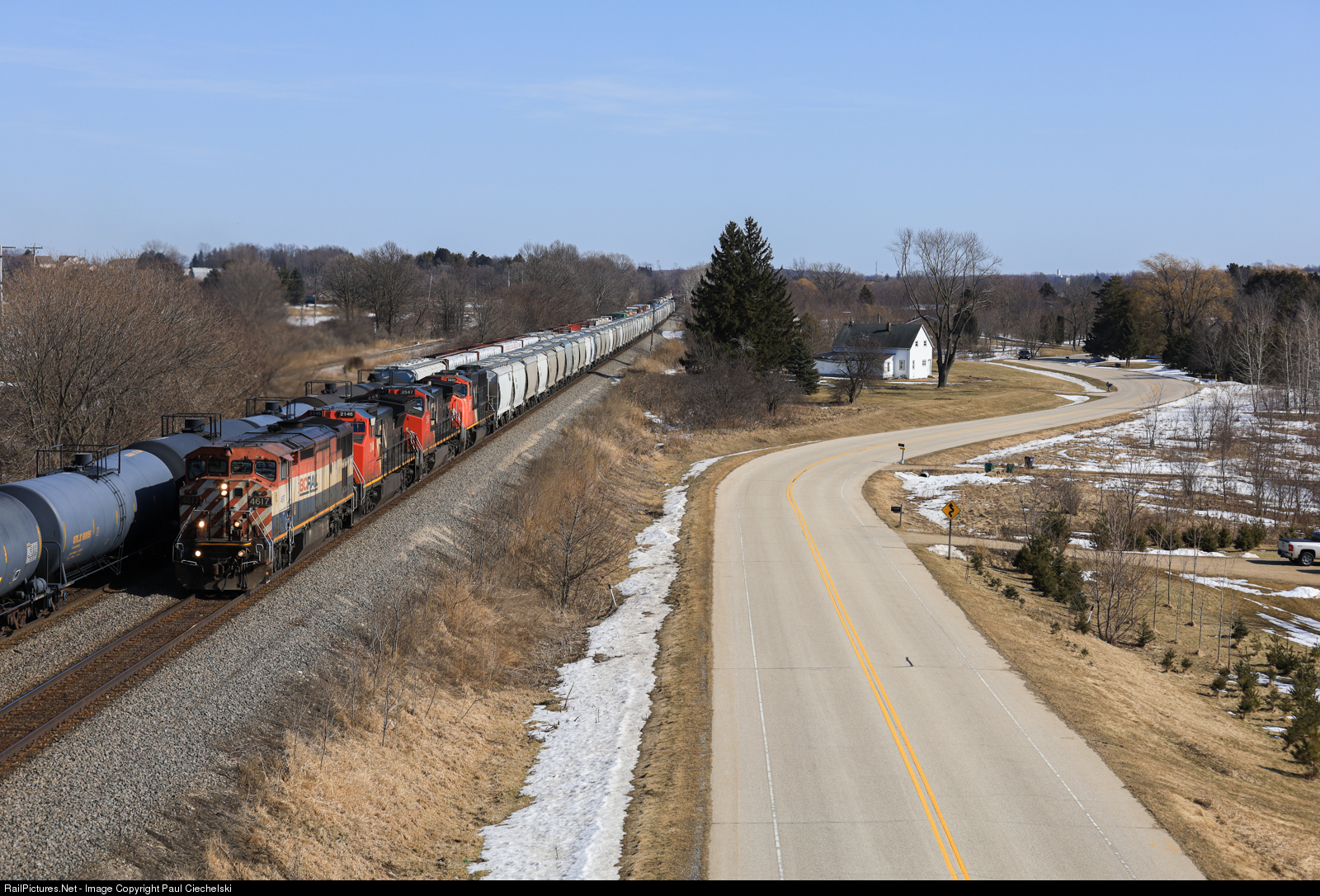 I was expecting to go north to simply catch local power, the Byron hill helper set, and common power; the last thing everyone expected was a BC Rail C40-8M to lead north. Here it is rolling past Ackerville, WI.