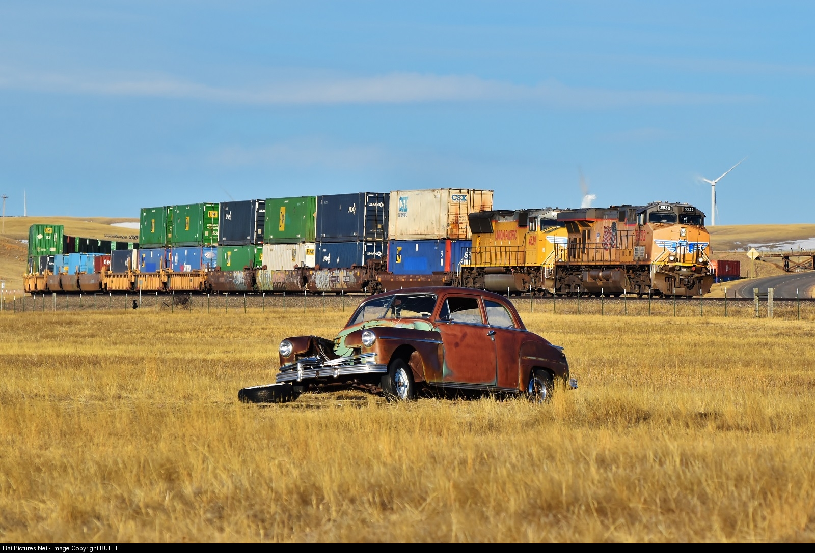 UP 5532 (ES44AC) runs past a rusty old 1949 Plymouth Special Deluxe, which sits in a field west of Cheyenne, Wyoming.