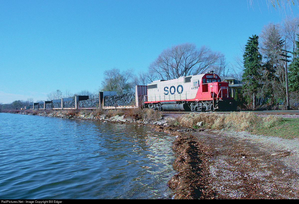 A Soo Line tie train works its way east on Milwaukee Road's former mainline at Pewaukee, WI along the shore of Pewaukee Lake. Soo Line inherited a double track mainline from MILW, but once CP took total control of the SOO, this mainline from Pewaukee to Hastings, MN was converted to CTC and single track.