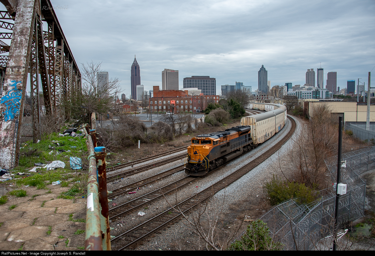 NS train 28Z is seen with the "Jersey Girl" Heritage Unit flying solo with the Atlanta Skyline providing a backdrop as it prepares to duct under Bankhead Avenue Bridge as the crew gets ready for a crew change at Jefferson Street.