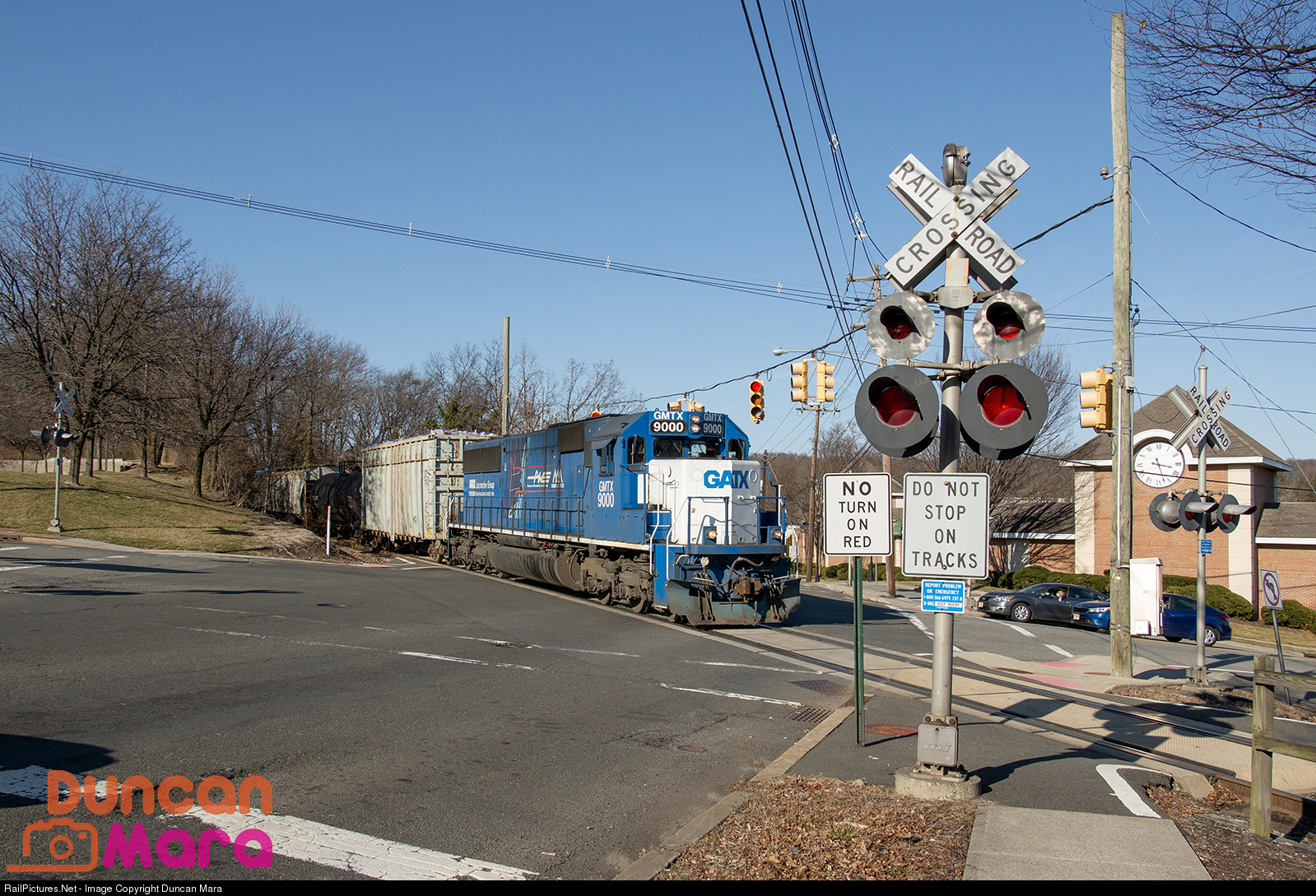 | VTR/P&W joint scheme GTMX 9000 leads NYS&W WS-4 across the 4-way intersection at Goffle Rd and Wyckoff Ave in Midland Park, NJ. The unit has been on lease to the NYS&W since the railraod wrecked two of their SD60s in a derailment in 2018. |