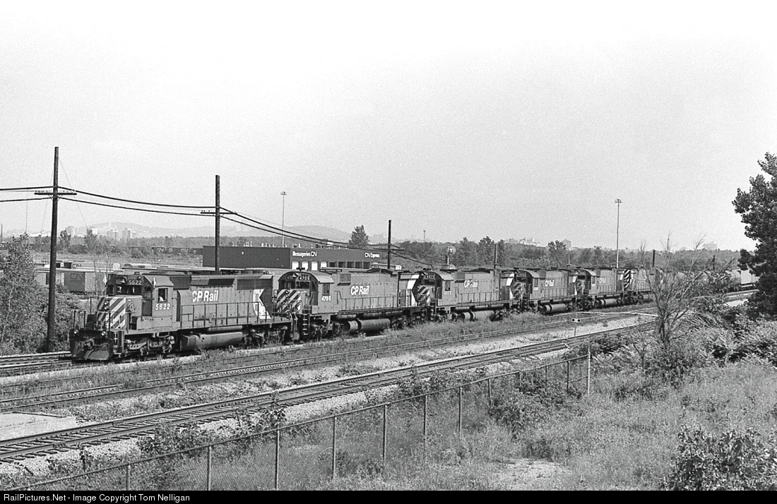 | Probably enough locomotives here to keep things moving as a westbound Canadian Pacific freight out of Montreal with six EMD and MLW units up front growls through Lachine, Quebec, on a summer morning. An SD40-2 leads five M636/M630s. Six-axle MLW power was not uncommon in the area at the time. |
