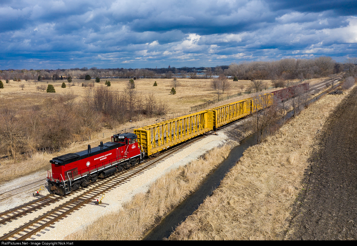 The Burlington Junction Railway finds a lucky sucker hole in the clouds as MP15AC #1521 pulls on six empty lumber cars.