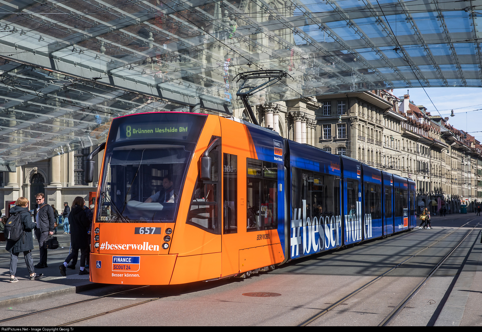 Siemens Combino XL Be 6/8 # 657 lowfloor streetcar of Bernmobil in the publicity paint scheme for "Finance Scout 24" in the Bern Bahnhof station on the Bubenbergplatz, running as line 8 to Brünnen Westside Bhf.