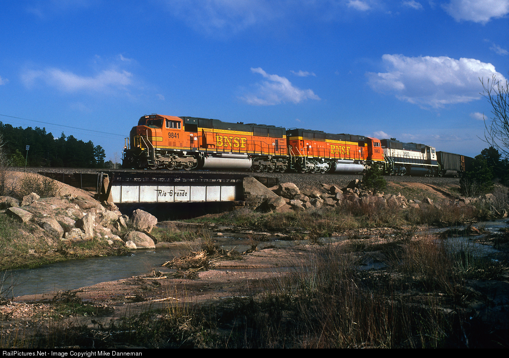 A Burlington Northern Santa Fe empty unit coal train crosses a bridge over Carpenter Creek at Larkspur on May 14, 1999. The train is powered by a trio of EMD SD70MACs, running over a section of northbound track owned by Rio Grande, which is still proudly displayed on the small bridge.