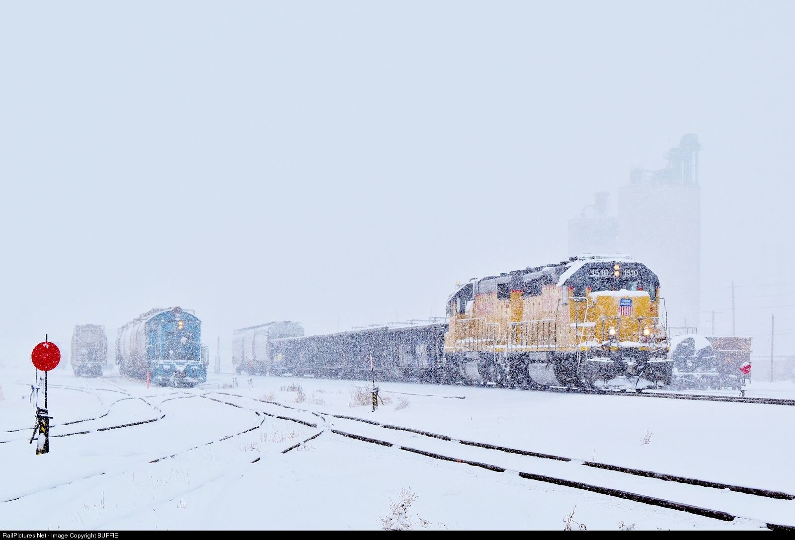 | UP 1510 runs a small freight in heavy snow past the ConAgra SW1200 that works the Commerce City Grain yard. 1510 has quite a history, having started life in 1969 as a GP40 with the B&O Railroad, then worked for the Southern Pacific as a rebuilt GP40M-2, and finally the Union Pacific. Just imagine the miles that 51 year old engine has traveled. |