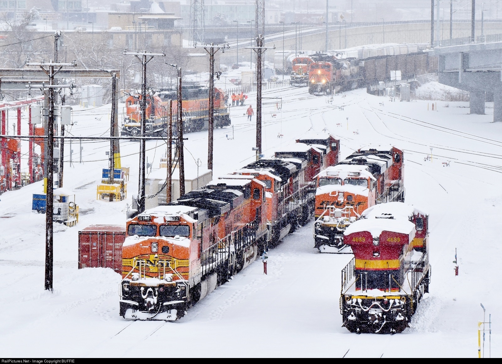 The heavy snow is making conditions rough for trains coming out of the Denver Yard, and a loaded coal waits while yard crews struggle to clear the switches of ice.