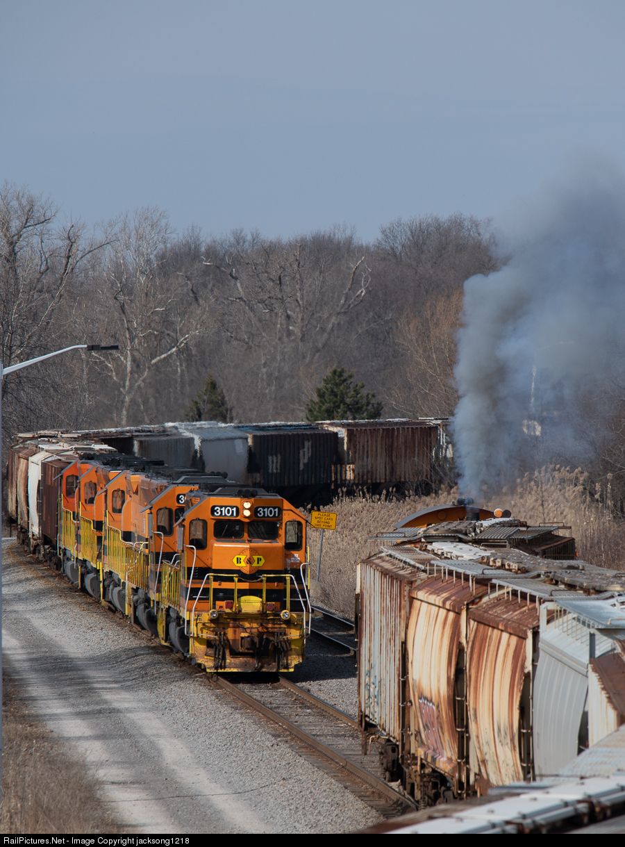 After arriving at the American Rock Salt mine in Mount Morris, NY, the crews from GW-1 and the mine perform the "swap". GW-1 first uncouples from the string of empties they brought in, and shoves in to connect to the loaded train waiting for them in the yard. Next the mine crew uses 2 two G&W end cabs (1000 & 1001, both SW1001s) to pull the empty train out of the way so GW-1 can leave the mine with the loaded train. The two end cabs work hard as they start to pull the train into the siding track.