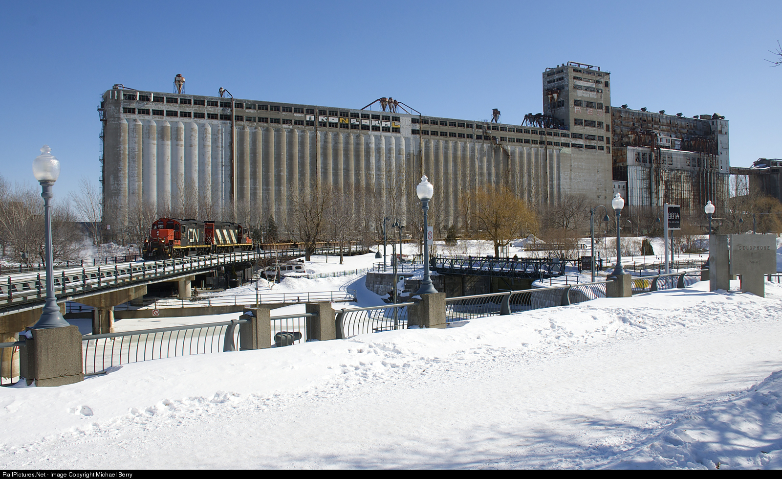 | The Pointe St-Charles switcher is cooling its heels in front of grain elevator #5 as they await paperwork being sorted out before the Port of Montreal gives them the green light to proceed. Power is GP9's CN 7250 & CN 4139 and the train consists entirely of baretables. |
