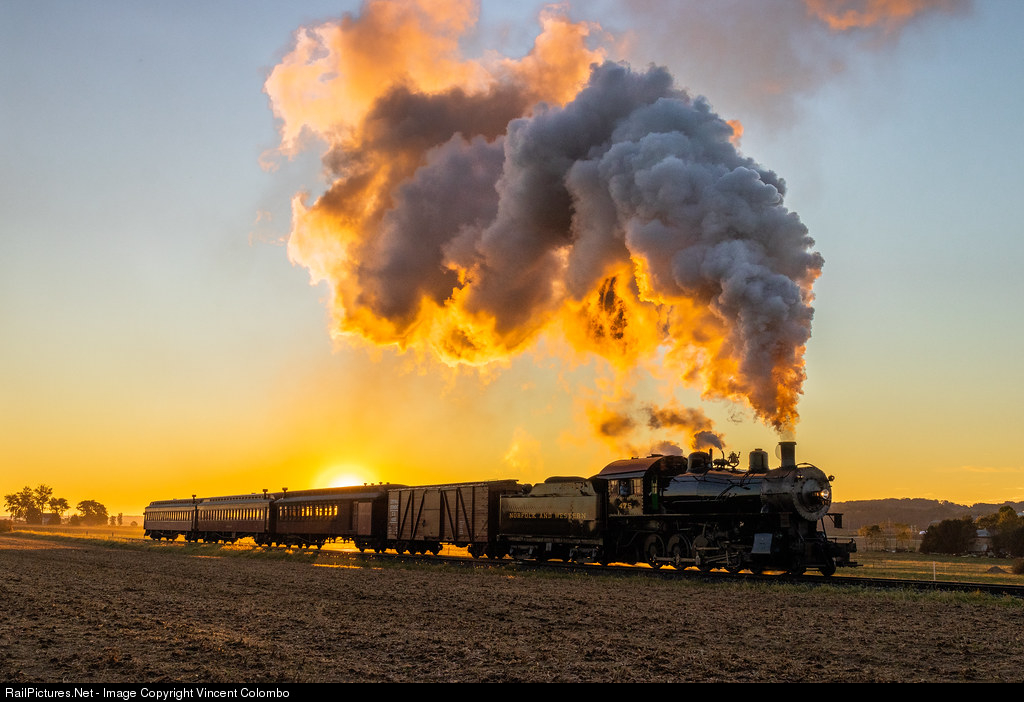 | Strasburg Railroad 475 (ex-N&W 4-8-0) leads a mixed passenger train by Verdant View Farms in Ronk's, PA during a Lerro Productions photo charter. The sun has just risen and casts an orange glow right behind the train. |