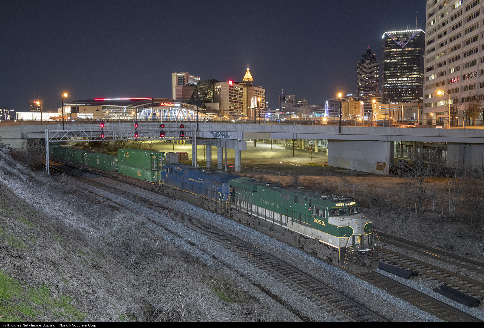 Led by the Southern and Norfolk and Western heritage units, Norfolk Southern train 209 passes through “the Gulch” in downtown Atlanta, moving intermodal equipment from Atlanta’s Inman Yard to Miami, by way of interchange with the Florida East Coast Railway in Jacksonville. Photo by Casey Thomason. For more information about Norfolk Southern, visit www.nscorp.com