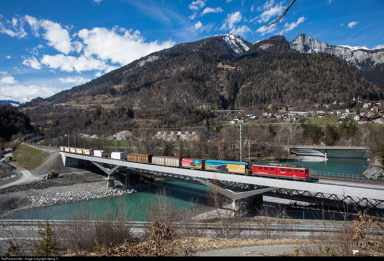 Ge 6/6 II # 706 "Disentis/Mustér" with the freight train 5140 from Pontresina to Landquart is crossing the Hinterrhein on the new bridge in Reichenau-Tamins.